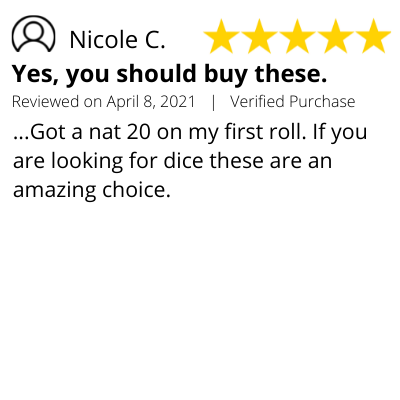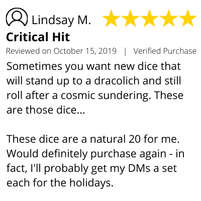 Every single dice set purchased from our website is protected with a lifetime warranty. No catches, no gotcha's, just a commitment to excellent quality and responsive customer service by fellow gamers.