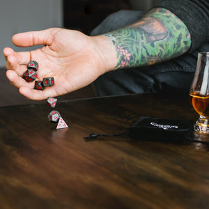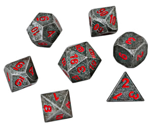 These dice are made of a non-toxic zinc alloy. Each order comes with a D4, D6, D8, two D10s (one 00-90, one 0-9), D12, and D20; includes a velvet drawstring bag.