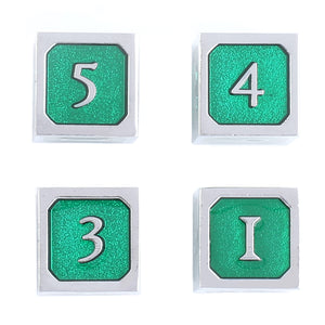 • What’s in the box: 4-piece metal D6 dice set and a velvet dice pouch