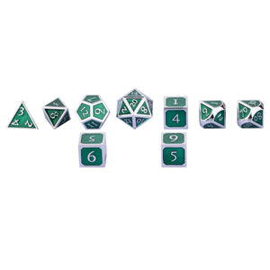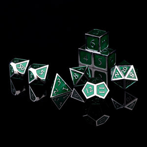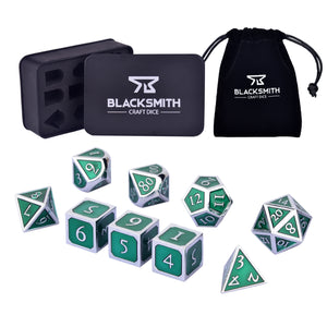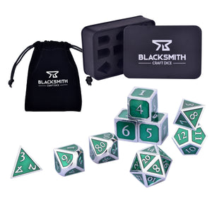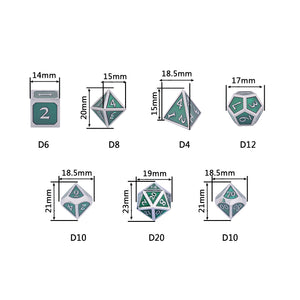 These dice are made of a non-toxic zinc alloy. Each order comes with a D4, 3xD6, D8, two D10s (one 00-90, one 0-9), D12, and D20; includes a velvet drawstring bag and a metal tin.