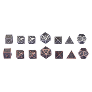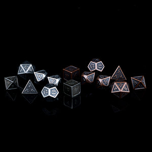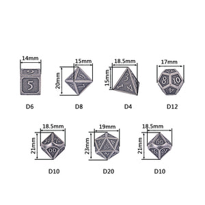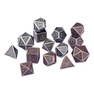 These dice are made of a non-toxic zinc alloy. Each order comes with a 2xD4, 2xD6, 2xD8, 4xD10s (two 00-90, two 0-9), 2xD12, and 2xD20; includes a velvet drawstring bag.