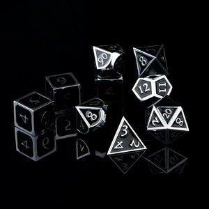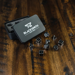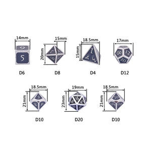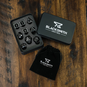 • What’s in the box: 9-piece standard metal RPG dice set (2 extra D6s) protected in a metal tin with custom foam and lid that doubles as a mini dice tray, plus a velvet bag.