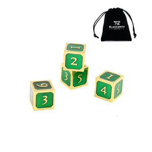These dice are made of a non-toxic zinc alloy. Each order comes with 4xD6 and a velvet drawstring bag.