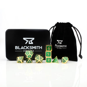 • What’s in the box: 9-piece standard metal RPG dice set (2 extra D6s) protected in a metal tin with custom foam and lid that doubles as a mini dice tray, plus a velvet bag.