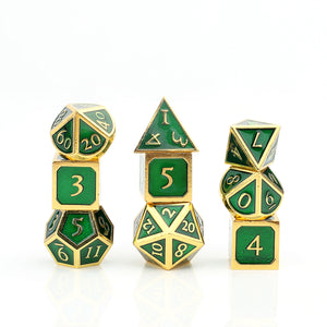 These dice are made of a non-toxic zinc alloy. Each order comes with a D4, 3xD6, D8, two D10s (one 00-90, one 0-9), D12, and D20; includes a velvet drawstring bag and a metal tin.