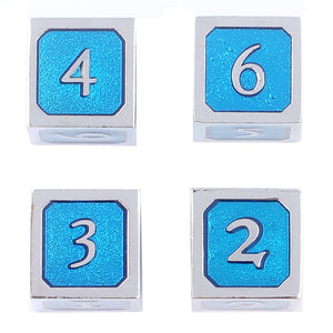 • What’s in the box: 4-piece metal D6 dice set and a velvet dice pouch