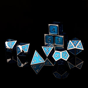 These dice are made of a non-toxic zinc alloy. Each order comes with a D4, 3xD6, D8, two D10s (one 00-90, one 0-9), D12, and D20; includes a velvet drawstring bag and a metal tin.