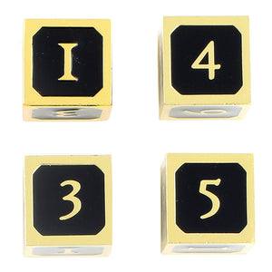 These dice are made of a non-toxic zinc alloy. Each order comes with 4xD6 and a velvet drawstring bag.