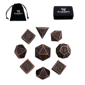 These dice are made of a non-toxic zinc alloy. Each order comes with a D4, 3xD6, D8, two D10s (one 00-90, one 0-9), D12, and D20; includes a velvet drawstring bag and a metal tin.