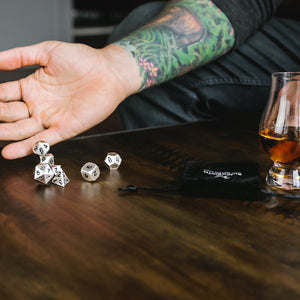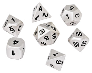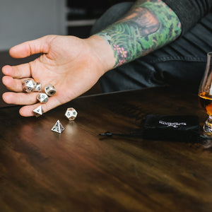 • What’s in the box: 7-piece standard metal RPG dice set and a velvet dice pouch